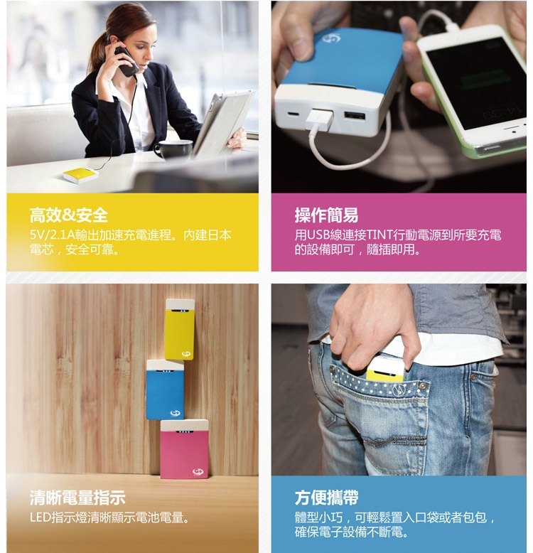 (本資訊由廠商提供,不代表PCDIY!立場) 2015-03-19 00:00:00曜嘉科技新品牌G+推出首款行動電源——有著繽紛色彩的TINT系列。該系列貼心照顧不同的用戶需求——8700mAh,11600mAh 兩種容量的鋰離子電池任君選擇,讓你的手機和其他任何USB設備整天都電量滿滿;內採用高級日系電芯,台灣製造,通過國家BSMI認證,並且有多重保護設計,不用再擔心充電安全問題;繽紛的外觀設計給你的生活添加一抹色彩,讓你的生活即使是充電時刻也能盡情樂享色彩。