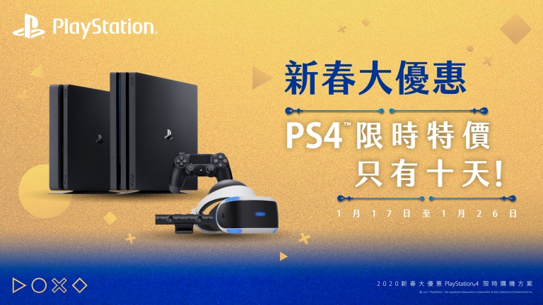 Sony Interactive Entertainment Taiwan Limited (SIET) 宣布,將於1月17日(五)起至1月26日(日)推出「PlayStation 新春大優惠」限時購機方案,包含PlayStation®4(PS4™)、PlayStation®4 Pro(PS4™Pro)與PlayStation®VR(PS VR)皆祭出限時特價。只有10天,全台限量提供