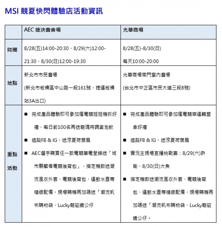 8/28(五)-8/30(日)活動期間於AEC、光華商場競夏快閃體驗店購買任一款MSI筆電,即可現場兌換潮流帆布購物袋、Lucky龍磁鐵公仔,出示AEC選手報名文件,8/30以前完成線上登錄通過後還可獲得「城市襲擊者電競後背包」(市價NT$3,899) 乙個,指定機款再送潮流風衣外套、電競後背包、運動水壺等精緻配備!