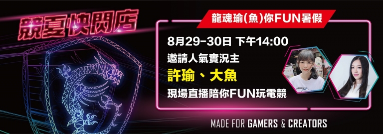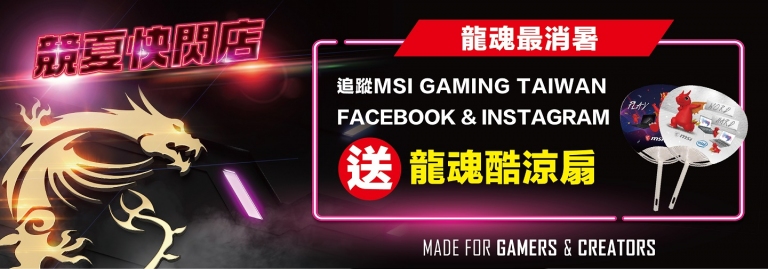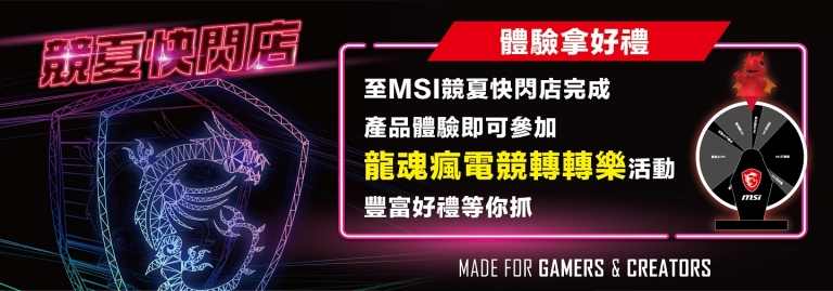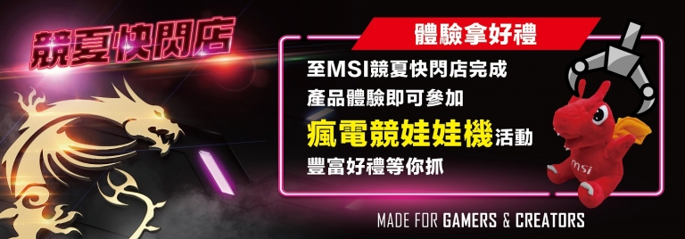 「MSI競夏快閃體驗店」活動將同步於台北光華商場進行,將展示新款電競筆電與創作者筆電,同樣準備了趣味體驗活動與滿滿獎品給龍粉們!活動期間完成產品體驗即可參加「瘋電競幸運轉盤」活動一次,多樣精緻好禮等你拿!追蹤MSI GAMING TAIWAN官方臉書及Instagram帳號,再加碼送涼夏荷葉扇!活動期間邀請知名遊戲實況主許瑜、大魚輪番坐鎮快閃體驗店,邀請粉絲拿出你的私房遊戲密技來挑戰!成功挑戰實況主的玩家,將有機會獲得Lucky公仔周邊紀念品!