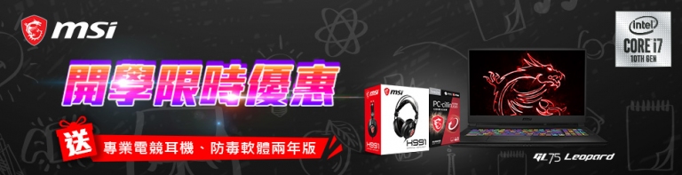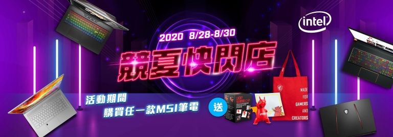 適逢暑假尾聲,即將迎接新學期新氣象,為自己挑選一款神配備,現在正是時候!MSI精選多款返校推薦筆電,讓你報告、繪圖、遊戲一次滿足!主流效能窄邊框大視野首選GF75 / GF63 Thin,搭載最新第10代 Intel Core i7-10750H處理器、GeForce® GTX 1650獨立顯示卡,鋁合金材質輕量且堅固耐用,極窄邊框讓視野更加寬闊,打game更爽快!原價NT$43,900起,開學限時優惠價NT$33,900起,現省萬元、再加碼送玩家防毒軟體兩年版、專業電競耳機。競速狂飆GL75 / GL65 Leopard炫彩電競筆電,搭載最新第10代 Intel Core i7-10875H處理器、GeForce® GTX 1650 Ti獨立顯示卡,搭載Steelseries單鍵RGB全彩背光電競鍵盤給你最蝦趴的視覺享受,Giant重低音喇叭音箱模組,比傳統音響大五倍的設計,遊戲中敵人的腳步聲、槍砲聲都能聽得一清二楚!GL75 / GL65 Leopard原價NT$49,900,開學限時優惠價NT$36,900,現省一萬三千元、再加碼送玩家防毒軟體兩年版、專業電競耳機。8/28(五)-8/30(日)活動期間於AEC、光華商場競夏快閃體驗店購買任一款MSI筆電,即可現場兌換潮流帆布購物袋、Lucky龍磁鐵公仔,出示AEC選手報名文件,8/30以前完成線上登錄通過後還可獲得「城市襲擊者電競後背包」(市價NT$3,899) 乙個,指定機款再送潮流風衣外套、電競後背包、運動水壺等精緻配備!