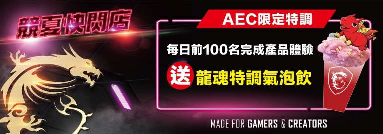 MSI為「亞洲電競公開賽」(AEC)官方指定電競筆電,本次AEC總決賽將於新北市市民廣場盛大舉行,MSI也將在會場設置快閃體驗店,展示GS66 Stealth纖薄黑魂、GE66 Raider炫彩旗艦等多款電競選手指名愛用的決勝遊戲配備,提供消費者體驗英雄聯盟、爐石戰記等AEC賽事遊戲!活動期間至AEC競夏快閃體驗店試玩新款電競筆電,即可參加「瘋電競娃娃機」活動一次,撲克牌、防疫口罩套、運動毛巾、Lucky龍公仔模型、鑰匙圈等每天限量500份精緻小禮等你來拿!每日前100名完成體驗還可享用「龍魂特調氣泡飲」一杯,超Q的Lucky龍漂浮在白色棉花糖雲朵上,搭配冰涼氣泡飲料,好拍又消暑的夏日聖品,只有在AEC總決賽會場才有,龍粉們千萬不能錯過!