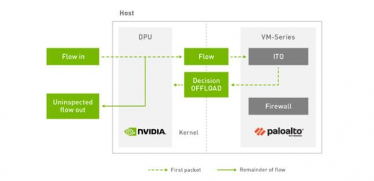 DPU 透過將流量從主機處理器卸載到獨立於伺服器 CPU 的專用硬體上,可加速對封包的過濾和轉發。該解決方案讓每一台伺服器在不犧牲網路效能的情況下,都能擁有 Palo Alto Networks 新一代虛擬防火牆的入侵防禦和進階網路安全功能,同時還能對網路流量的相關部分進行智慧篩選,並將其餘的流量卸載到 DPU,實現以往無法達成的流量檢查。