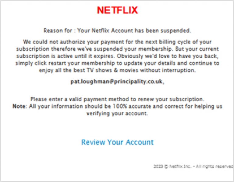 在 2023 年第一季 Check Point 曾發現一封冒充 Netflix 的惡意網路釣魚電子郵件。這封看似來自「Netflix」的電子郵件,實際上來自一個 Webmail 地址「support@bryanadamstribute[.]dk」;其主旨為「請更新—帳戶暫停服務」,信中聲稱收件人的 Netflix 帳戶因次期帳單未授權已暫停服務,並提供一個續訂連結要求受害者輸入付款資訊,但該連結卻將使用者導向惡意網站「https://oinstitutoisis[.]com/update/login/」,企圖竊取其付款資訊。關注 Check Point Software
