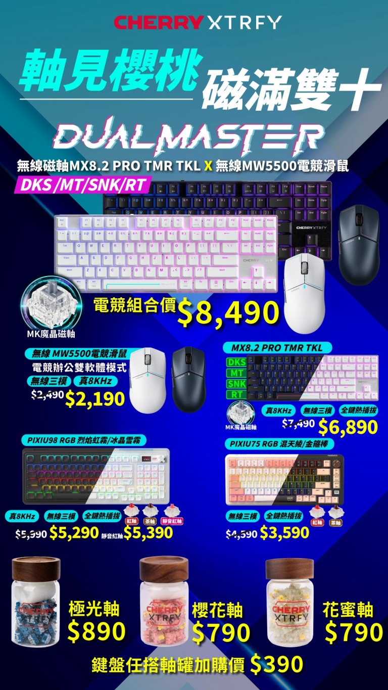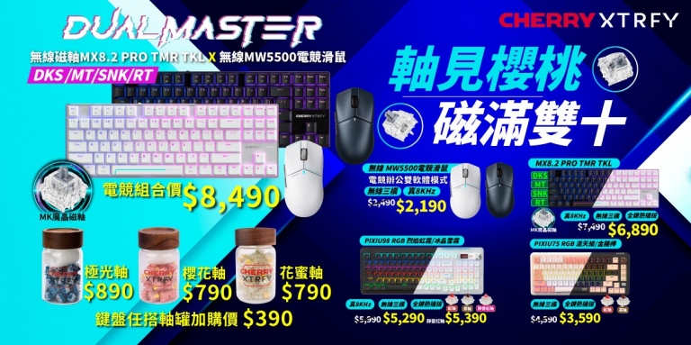 2025年9月,CHERRY 以「軸見櫻桃 磁滿雙十」為主題,不僅推出 MX8.2 PRO TMR × MW5500 DualMaster磁力組合優惠,更祭出 PIXIU 98 / 75 三模系列降價回饋,加上全新 MX2A 軸罐「櫻花軸、蜂蜜軸、極光軸」,讓玩家從鍵盤、滑鼠到軸體一次升級,享受德國工藝帶來的極致體驗。