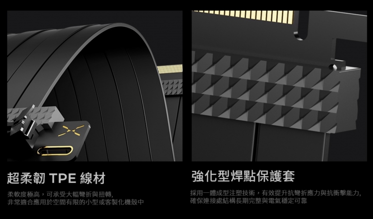 採用 TPE 與編織護套,具備優異柔韌度與保護性,安裝過程中能靈活調整路徑,避免折損。黑白雙色款式,契合不同機殼與顯卡風格需求。適合你