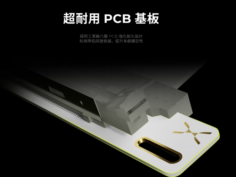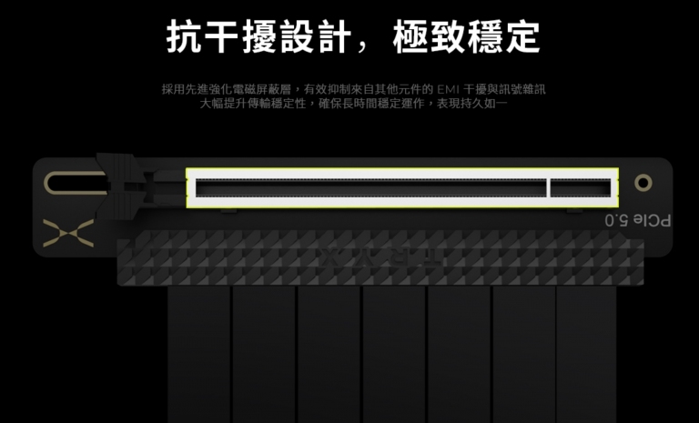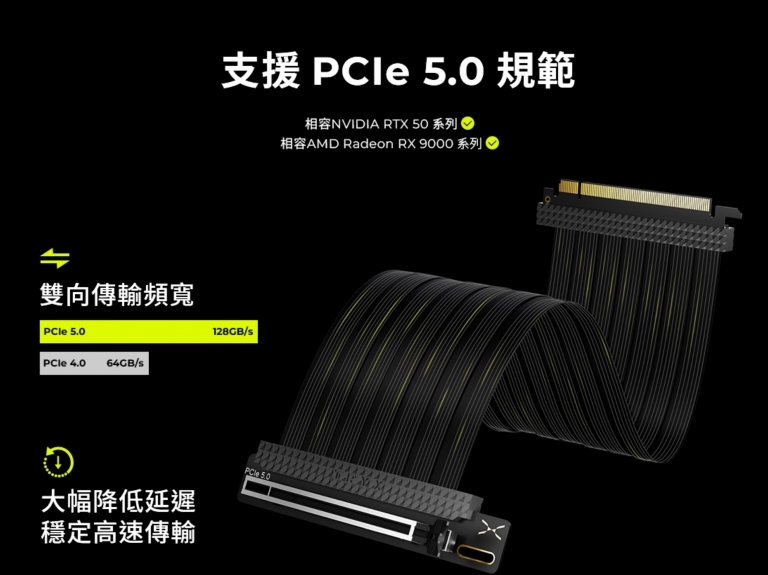 支援 單向 64 GB/s、雙向 128 GB/s 全速傳輸,完整滿足最新世代顯卡與運算平台需求,並向下相容 PCIe 4.0 / 3.0,兼顧前瞻性與靈活應用。多層屏蔽 & 強化 PCB|高速下依舊穩定