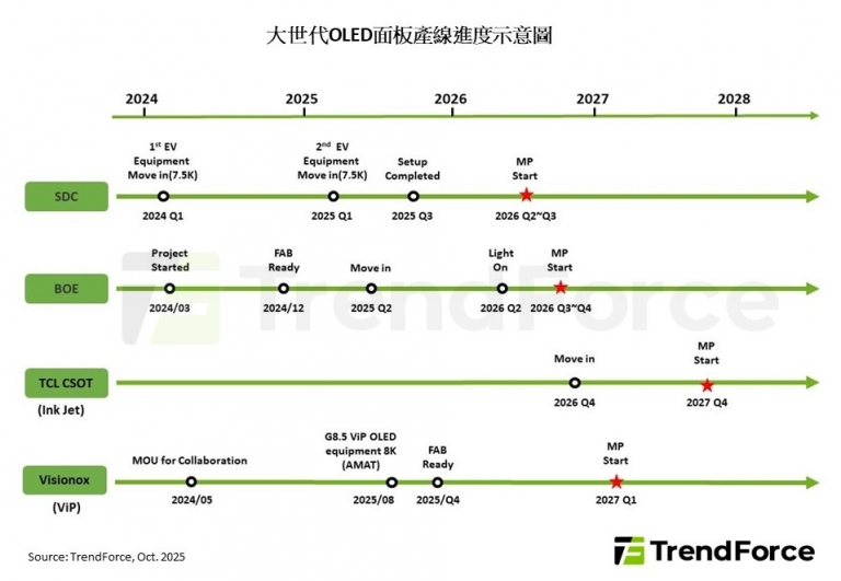 文.圖/張國華 2025-10-28 14:35:46隨著近期TCL CSOT正式宣布t8項目OLED 8.6代線開工,全球IT OLED面板大世代投資計畫正式進入百花齊放局面。TrendForce表示,韓系面板廠SDC為市場先行者,最早啟動8.6代線大世代OLED產線投資,陸系廠商如BOE、Visionox、TCL CSOT也相繼啟動8.6代OLED產線投資。