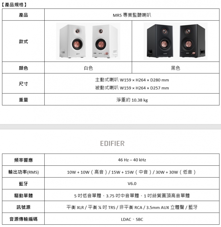 EDIFIER MR5 專業監聽喇叭整體線條簡潔俐落,並提供簡約的黑、白兩色選項,建議售價新台幣 6,790 元。