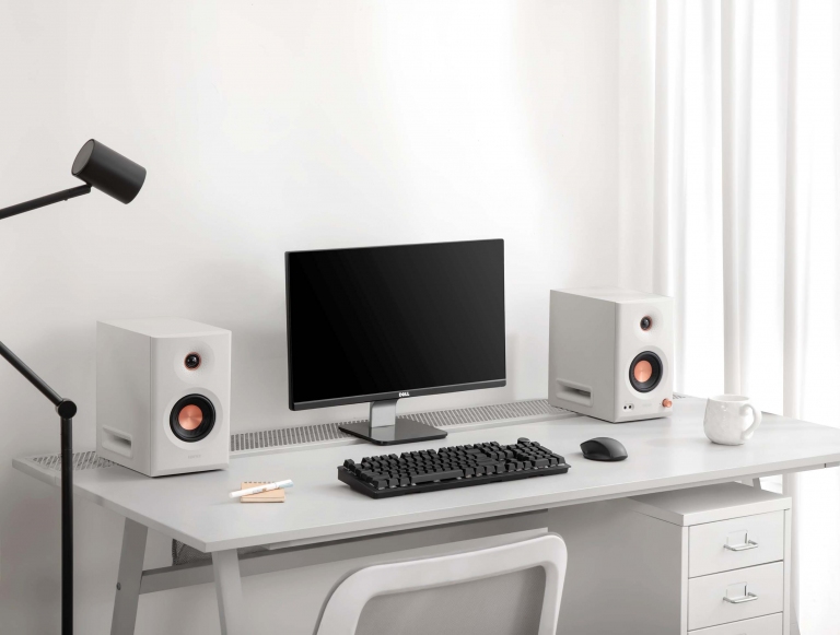 一鍵即可在創作與日常聆聽間自由轉換,輕鬆調整最適音色表現。外觀設計方面,MR5 專業監聽喇叭延續 MR 系列的經典設計語言,整體線條簡潔俐落,並提供簡約的黑、白兩色選項。其中,音量旋鈕與中音單體防塵蓋上更加入紅銅點綴質感,優雅且柔和的外型能輕鬆融入各種生活與工作空間。MR5 專業監聽喇叭亦維持書架型喇叭的空間優勢,讓民眾不須改變桌面空間也能輕鬆升級實力與設計質感兼具的喇叭。
