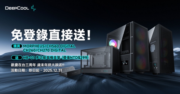 文.圖/陳信榮 2025-11-12 19:01:07知名散熱品牌大廠 – DeepCool 九州風神在台三周年慶, 專屬好禮大放送!! 只要在活動期間內, 購買 DeepCool 九州風神指定型號電腦機殼, 即送指定機殼專款專用超實用的多功能耳機架 (市價:NTD$299), 數量有限、機會難得、敬請把握!