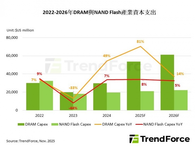其中,DRAM產業的資本支出在2025年預計將達到537億美元,預計在2026年進一步成長至613億美元,年增率達14%。NAND Flash部分,資本支出在2025年預計為211億美元,2026年預計小幅增長至222億美元,年增約5%。