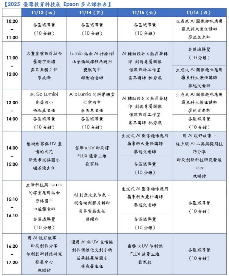 Epson在2025臺灣教育科技展的雙方案展示,完整呈現了中小學從智慧投影學習、互動體驗,到創客教育動手實作的完整學習旅程。互動投影讓學生在課堂上不只是聽講,而是能身歷其境地參與討論,創新的智慧教室,打造多元學習型態;創客教室則具體實現學生的設計發想,透過列印設備被轉化為真實的作品。當學生親手拿起自己設計並製作完成的成品時,那份成就感與喜悅,成為推動他們持續探索與創作的最大動力。Epson相信,當科技與創意在教育場域中相互融合,不僅能提升學習互動,更能讓每一次創作都成為難忘的經驗,為學習歷程留下鮮明的印記。*多元課程表詳見下頁說明