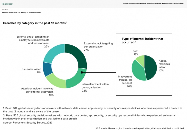 惡意程式與勒索軟體攻擊多從端點環境發動,而遠端辦公則可能比受保護的辦公室環境更容易成為攻擊者入侵的目標。根據 Forrester Research 於 2024 年 3 月發布的《Internal Incidents Cause Almost a Quarter of Breaches, With More Than Half Intentional》報告指出,約有 22% 的資安入侵事件起於員工的遠端工作環境。Forrester《Internal Incidents Cause Almost a Quarter of Breaches, With More Than Half Intentional》,2024 年 3 月發布