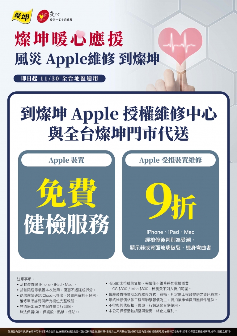 即日起至11月30日期間,燦坤 Apple 授權維修中心也提供Apple裝置免費健檢服務(限 iPhone、iPad、Mac),以及全台燦坤門市支援代送Apple受損裝置維修9折優惠(iPhone、iPad、Mac 經檢修後判別為受潮、顯示器或背面玻璃破裂、機身彎曲者),消費者送修前請先確認iCloud已登出、裝置內資料不保留、維修單須詳閱與所有欄位完整親簽,非原廠出廠之零配件請自行卸除,無法保留(如:保護殼、貼紙、保貼),若因故未符合維修資格,報價後不維修將酌收檢測費-iOS 300元 / Mac 800元;檢測費不列入折扣範圍,最終裝置損壞狀況與維修方式、資格,判定依工程師提供之資訊為主,且不得與其他折扣、優惠、行銷活動合併使用。