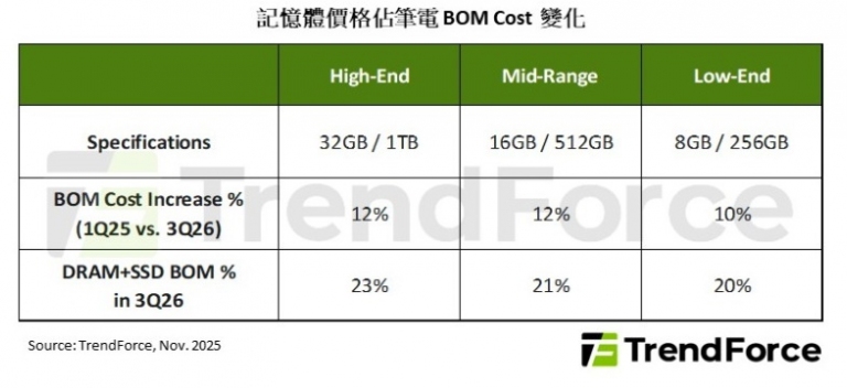 2026年筆電市場同樣將面臨明顯挑戰,以今年記憶體上漲前的成本結構為基準觀察,DRAM及NAND Flash合計占筆電整機BOM cost的比重約10~18%,在如此大幅且連續數季的上漲下,預估記憶體占整機BOM cost的比重將進一步擴大至20%以上。