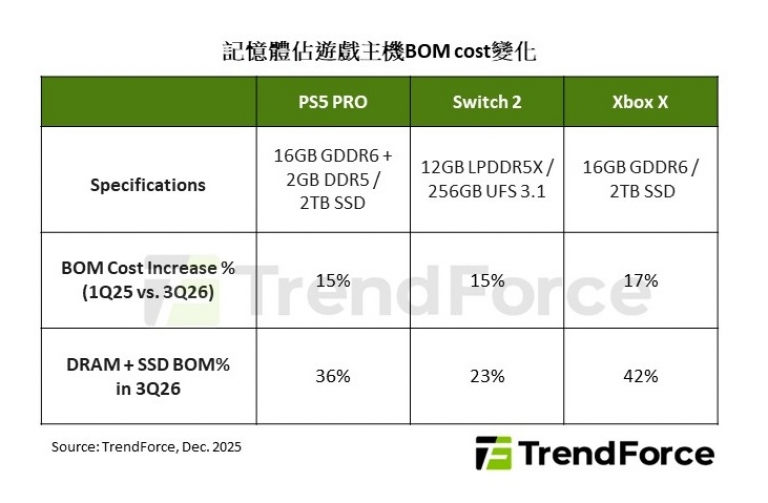 - TrendForce:記憶體價格飆升衝擊遊戲主機毛利,調降2026年出貨預估