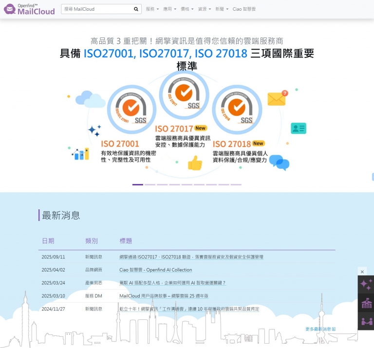 我們提出了ISO 27001、ISO 27017、ISO 27018與ISO 27550認證,主要就是告訴客戶,網擎資訊完善達到了資訊安全管理系統、雲服務資安管理、雲端各資保護管理與隱私設計和隱私保護工程的要求,消費者無須擔心資安出狀況與個資保護的問題!無論是企業用戶或政府單位,都可以安心無虞的使用我們的郵件系統與所有雲端服務!政府的法規跟國際的法規對資安的要求專案,MailCloud遵循國際標準,遵循台灣政府法規,因此就不用擔心服務會出問題,與宣稱的一致,如實的給客戶的一個承諾保證。