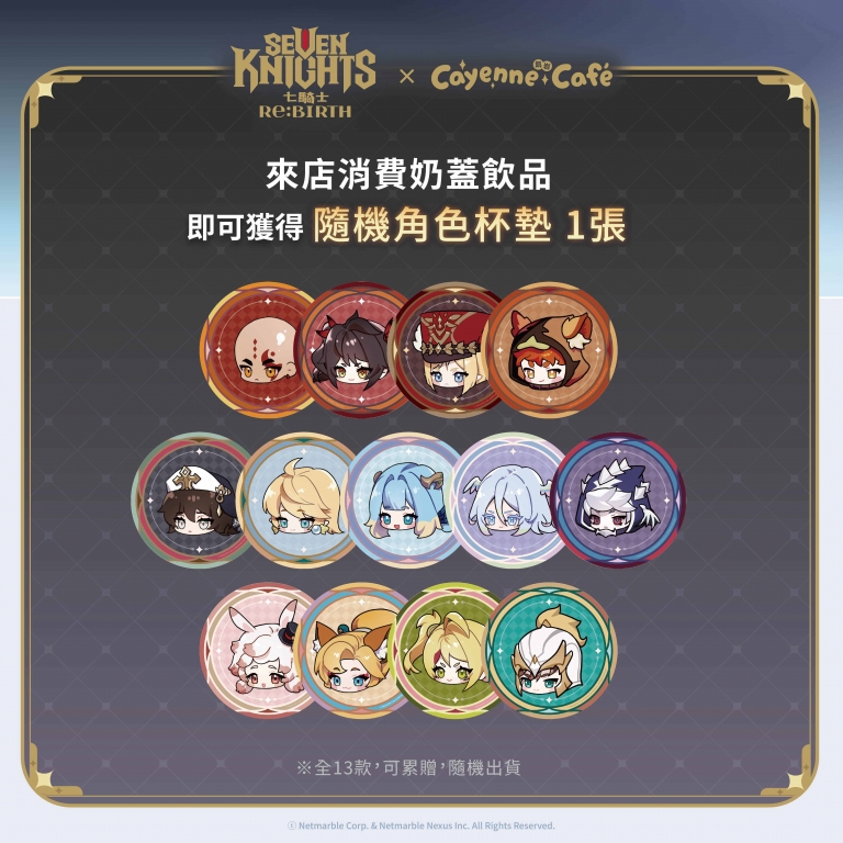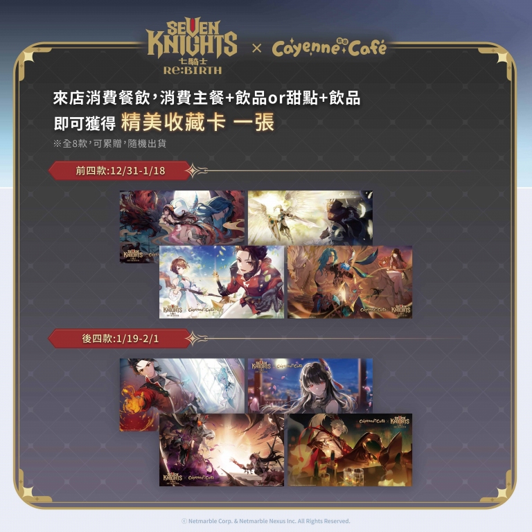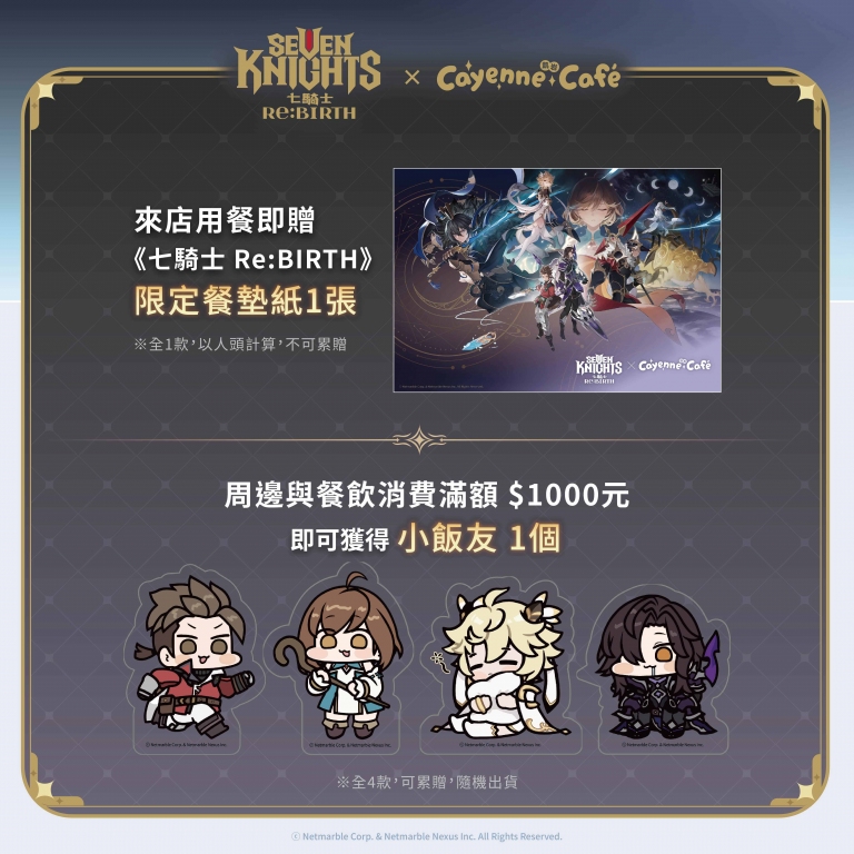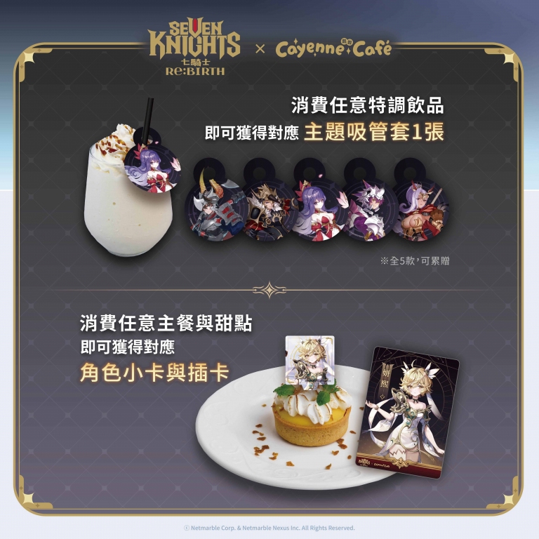 本次聯名合作更推出以遊戲英雄角色為主題的多款主餐、甜點與特調飲品,將英雄特色、技能轉化為創意料理,例如象徵路迪堅定信念的黃金炊飯,以及展現雷伊潔兒火焰之力的燒烤拼盤等,讓玩家在視覺與味覺上,都能感受到英雄角色的靈魂。凡於活動期間至咖啡廳消費,即有機會獲得《七騎士Re:BIRTH》Q版角色杯墊、角色精美小卡、主題吸管套等周邊好禮。活動期間前往用餐消費,即可獲得精美周邊好禮。