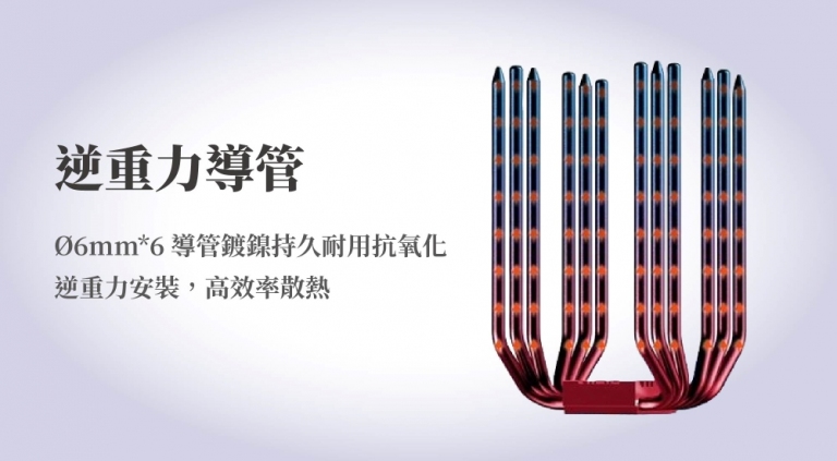 核心搭載 6 根高性能「逆重力熱導管」,並經過鍍鎳黑化處理:● 全角度適配: 優化後的液體毛細結構,讓散熱效能不受機殼安裝方向(直立或橫躺)影響。