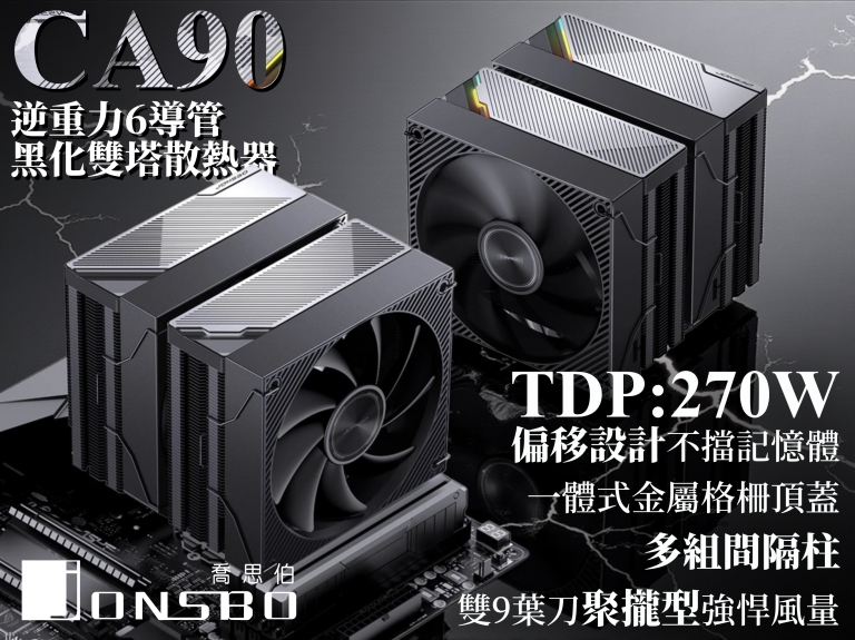 文.圖/陳仁智 2026-01-02 21:47:57喬思伯(JONSBO)第三代風冷家族的”散熱霸主”「CA90 黑化雙塔散熱器」。CA90 承襲三代塔扇了極具辨識度的金屬工藝基因,更以「黑化金屬風」外觀與震撼的實標解熱數據,向水冷市場發出挑戰。這是一場關於「黑化金屬」美學與「極限」效能的巔峰會合。