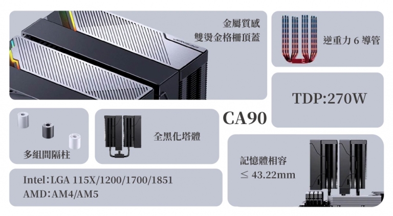 喬思伯堅持數據真實性,CA90 官方實標解熱功耗高達 D-TDP 270W。透過 6 根 Φ6mm 高性能熱導管與高密度雙塔鰭片,搭配貫穿式扣具,CA90 具備了壓制新世代 Intel i9 或 AMD R9 系列處理器的硬實力。