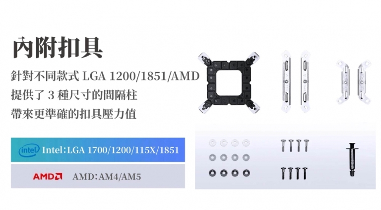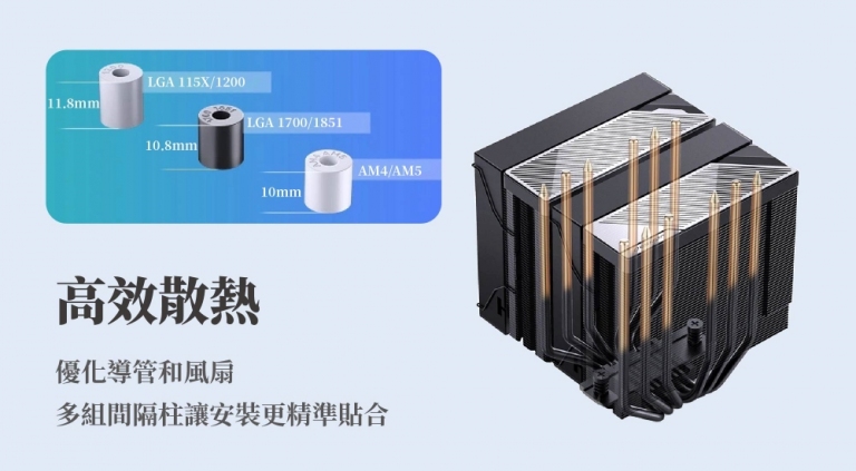 身為第三代霸主,安裝體驗同樣追求完美:內附多組間隔柱: 內附針對不同平台(LGA 1700/1851/AM5)量身打造的專屬套筒,確保扣具壓力精確適配 CPU 高度,達成最佳接觸效率。