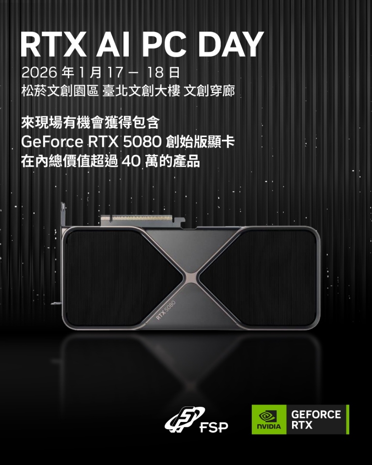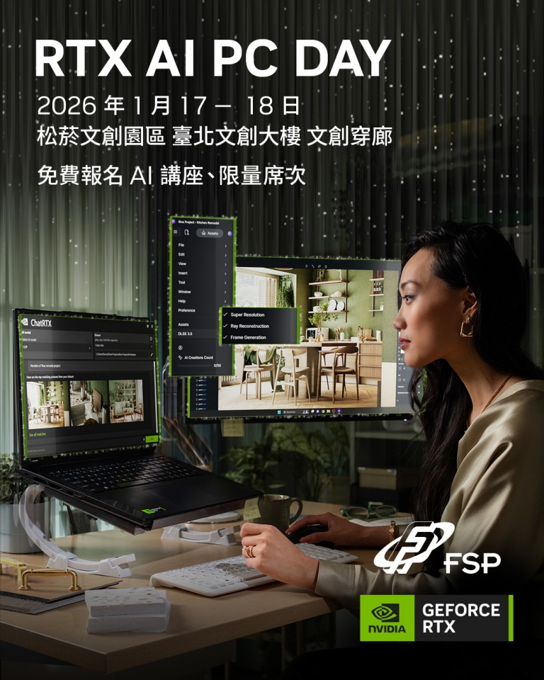 文.圖/陳信榮 2026-01-15 17:16:27全球知名電源供應器領導品牌-全漢電源,將作為電源合作夥伴,出席 NVIDIA GeForce主辦的年度重點科技活動 《RTX AI PC DAY》,活動將於 2026 年 1 月 17 日(星期六)至 1 月 18 日(星期日) 在台北松山文創園區文化創意大樓穿廊空間盛大舉行,全漢FSP將於現場展出符合 AI 趨勢、支援高效運算平台的電源產品系列,全面展現品牌技術實力,歡迎科技愛好者與玩家參觀體驗。