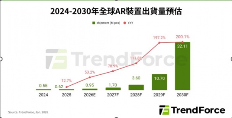 文.圖/陳信榮 2026-01-30 14:27:13根據TrendForce最新近眼顯示產業調查,隨著AI與穿戴式裝置深度融合,Meta Ray-Ban Display Glasses在終端市場獲得的回饋明顯優於預期,近半年內已大幅上修多項關鍵零組件訂單。在大廠推波助瀾之下,TrendForce預估2026年全球AR眼鏡出貨量將躍升至95萬台,年增率為53%。