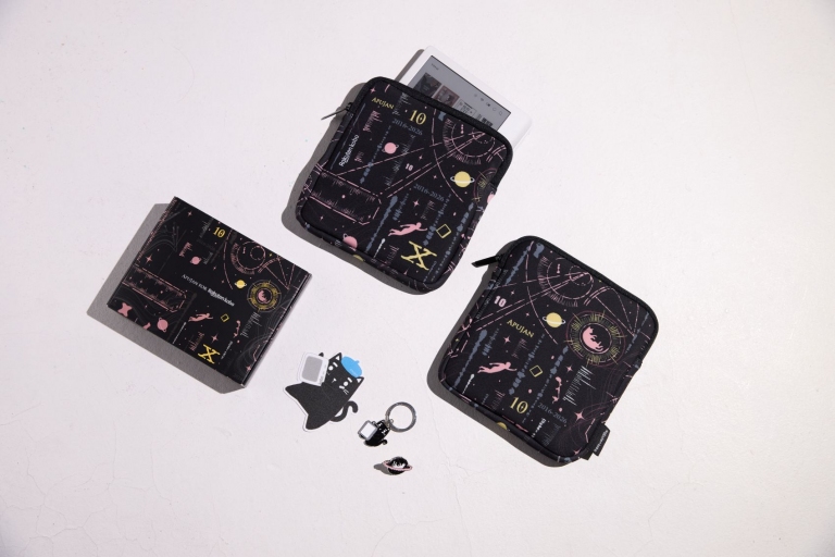 此外,樂天 Kobo 再度攜手國際時裝品牌 APUJAN 推出書展限定聯名系列。去年限定系列在書展熱銷,三天即完售。今年除了收納閱讀器的星際收納包(單售價新台幣 999 元,加購價新台幣 799 元)與宇宙碎片三件組(胸針、吊飾、特殊造型貼紙,新台幣 350 元),亦同步販售限量僅五套的 promoter 同款 Kobo x APUJAN 聯名 10 週年紀念服裝。將閱讀美學延伸至服裝穿搭與生活配件,成為書展現場備受矚目的話題亮點。
