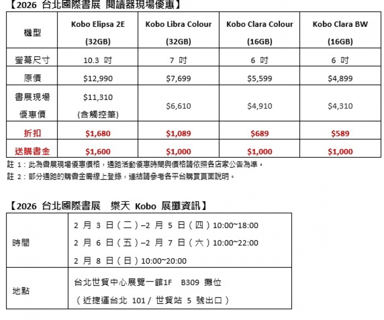 樂天 Kobo 於 2 月 3 日至 2 月 8 日參與台北國際書展,推出年度最超值的限定優惠