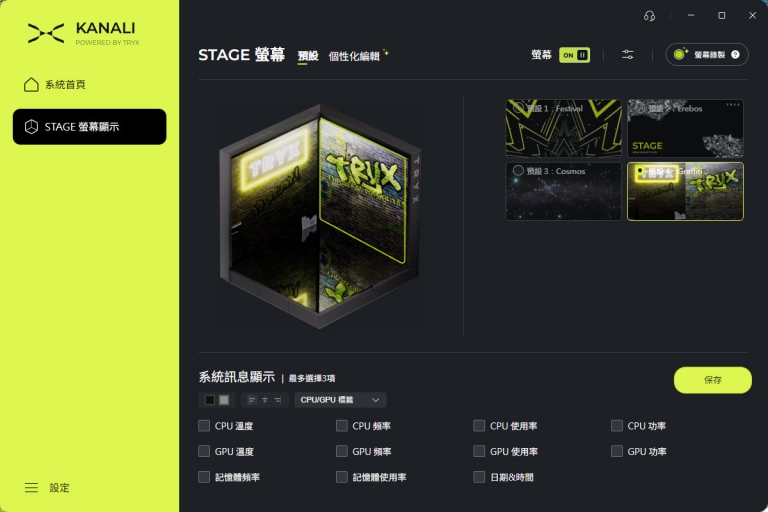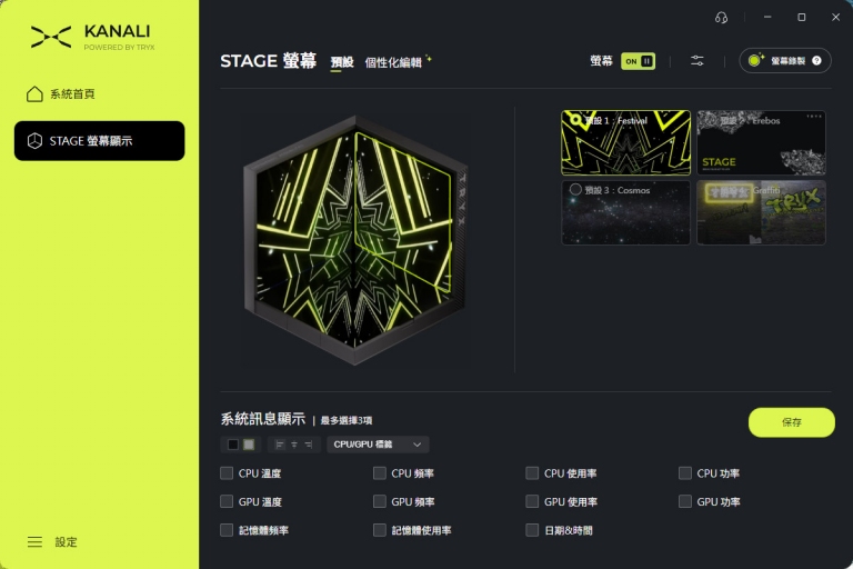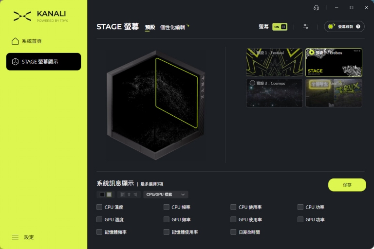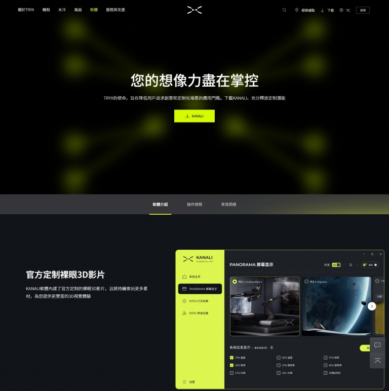 TRYX副總裁VP齊浩宇Nelson特別說明:「TRYX很自信地說是全球首款發佈、發售的AMOLED曲面屏的一體式水冷散熱器,且擁有6.5英寸超大螢幕和2K 解析度、60Hz 的刷新率。曲面的創新設計使其能夠從正面到左側面的多個角度完全可見,解決了傳統水冷螢幕的可見性問題。這一開創性的設計不僅提升了美觀度,還提高了其功能性。使用者能夠在享受豐富的媒體播放內容時,通過曲面屏的左側及前側同時監控系統參數。」TRYX副總裁VP齊浩宇Nelson鄭重介紹,為了讓曲面屏更“好玩”。我們專門開發了KANALI 軟體,這是 PANORAMA 極致體驗的核心,也是裸眼3D 高級功能的核心。KANALI預置了3條具有裸眼3D視覺效果的視頻素材,這大大降低了用戶體驗裸眼3D的門檻。且素材庫將保持更新,持續增強素材的可玩性。同時,KANALI還有分屏和錄屏功能,這個功能適用於需要多內容交互的遊戲玩家和專業人士,可以輕鬆捕捉並通過自訂內容庫,直接分享他們的遊戲高光時刻或創意內容。」