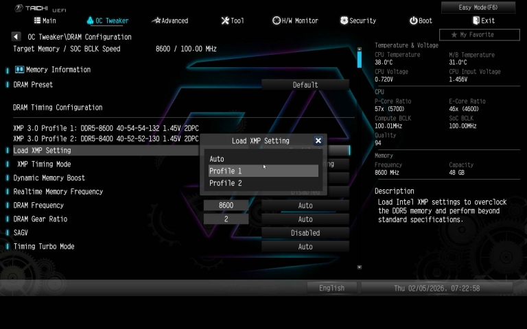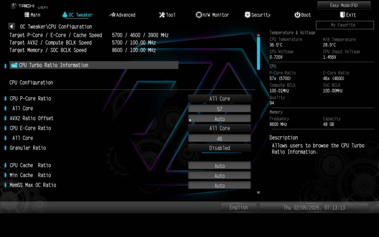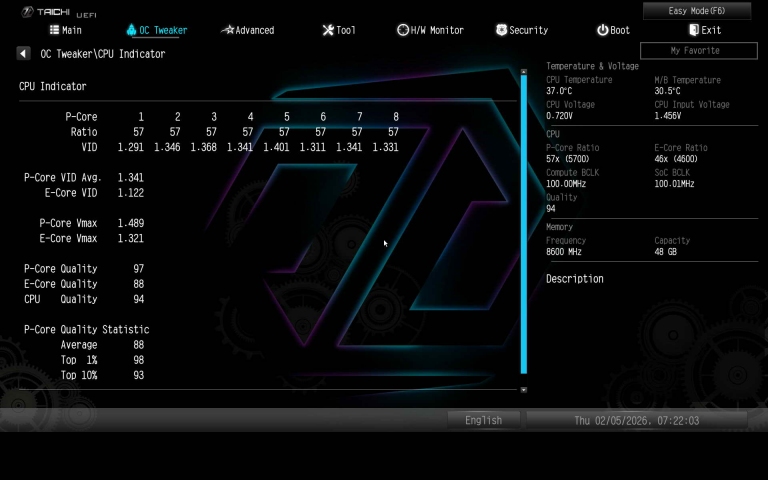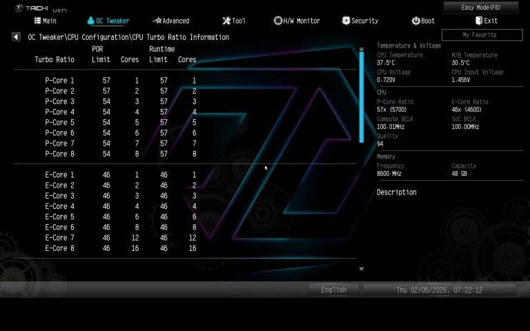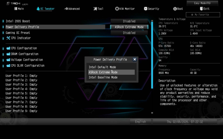 ●Power Delivery Profile:選用ASRock Extreme Mode●CPU-P-Core Ratio:選用All Core 全大核