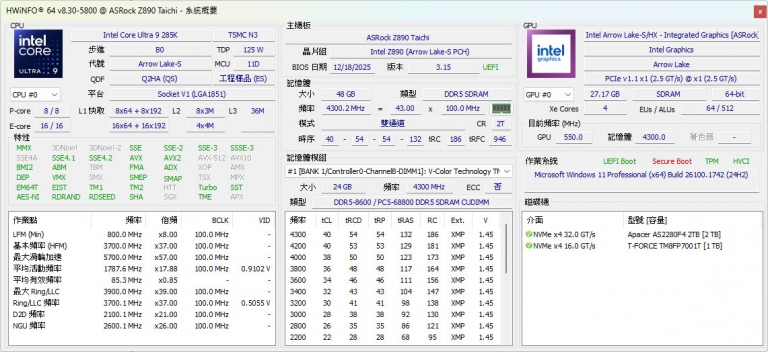 ●處理器:美商英特爾 Intel Core Ultra 9 285K(24心24執行緒)●主機板:華擎 ASRock Z890 Taichi(Intel Z890晶片組)