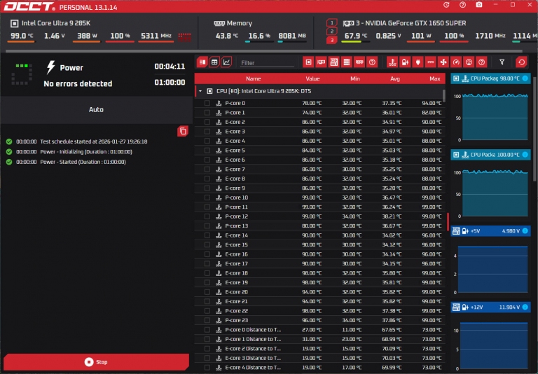 這邊使用OCCT燒機軟體,搭配Core Temp、HWiNFO 64,來進行燒機檢測,以瞭解「TRYX STAGE 360 ARGB 創氪星系 影域」CPU一體式水冷散熱器的CPU解熱能力。卸除功耗牆!開啟終極設定!Intel Core Ultra 9 285K,已經來到猛爆模式!