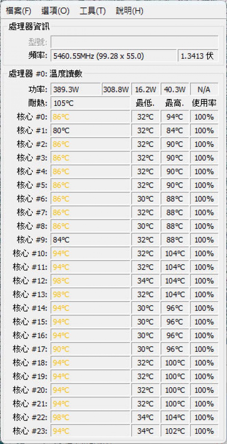 Intel Core Ultra 9 285K,在主機板BIOS卸除功耗牆之後,用OCCT燒機軟體進行燒機全速運行,可以發現CPU功耗最高來到了超過TDP:380W。值得注意的,持續監測CPU溫度,可以發現解熱能力超越TDP:380W,但已經讓這款CPU一體式水冷散熱器跑到了尖峰,CPU溫度平均已經達到了耐熱90~100°C的極限。