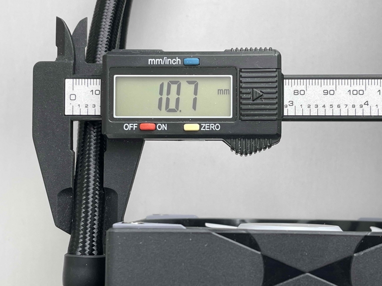 「TRYX STAGE 360 ARGB 創氪星系 影域」CPU一體式水冷散熱器,用上了厚度27 mm水冷排,水冷排厚度實量為27.4 mm ,水管長度為420 mm,用上EPDM材質管線,管徑外側實量為10.7 mm。對應「Intel LGA 1700/1851與AMD AM4/AM5主流平台」
