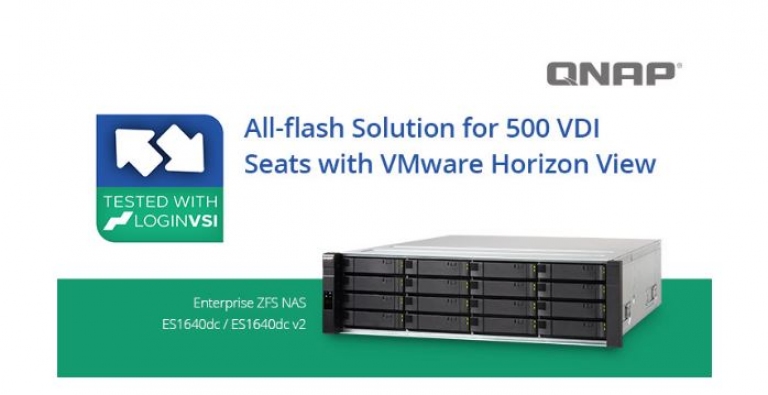本測試使用一台 QNAP ES1640dc,16 個硬碟插槽全數使用 SSD 並建立單一儲存池,以 10Gbps iSCSI 連結 Hypervisor 伺服器,並使用 VMware Horizon View 6 及連結複製建立持續存取的虛擬桌面環境。在同時部署與開機 500 個虛擬桌面的情境下,Enterprise ZFS NAS 單一控制器展現了極高效能,部署任務僅花費 60 分鐘,而開機動作更不到 7 分鐘即完成。虛擬桌面建立後,儲存池僅使用了 290GB 儲存空間,顯示採用 ZFS 檔案系統的 NAS 作業系統 (支援精簡配置 (Thin Provisioning)、資料重複刪除 (Data Deduplication) 與即時資料壓縮 (In-Line Compression)) 在 VDI 環境中可節省高達 99% 的資料儲存空間。