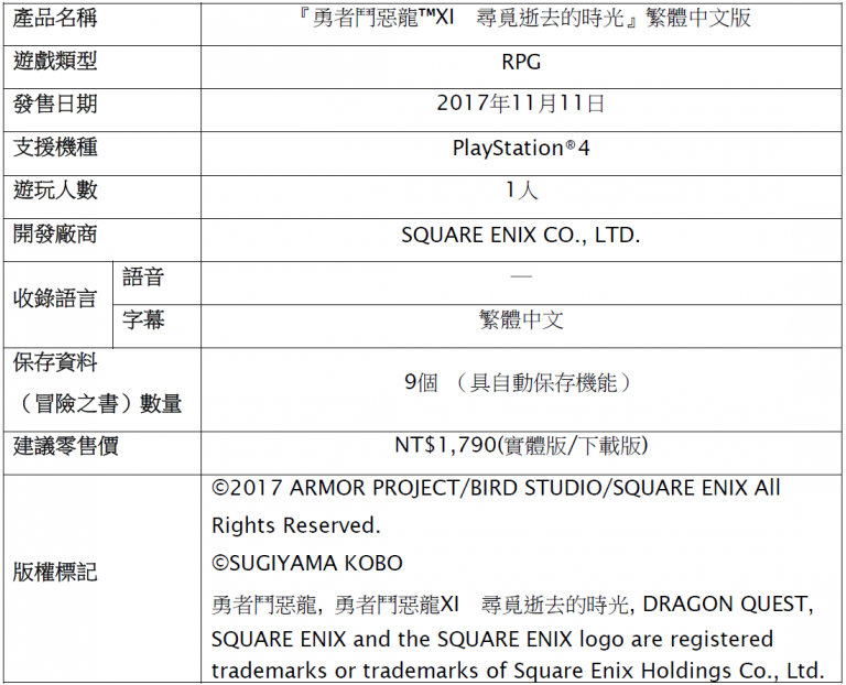 Sony Interactive Entertainment Taiwan Limited (SIET) 今日宣布, 將於2017年11月11日推出的PlayStation®4 (PS4™)專用遊戲『勇者鬥惡龍™XI 尋覓逝去的時光』繁體中文版(NT$1,790),實體版即日起開始接受預訂,成功預訂的玩家將可獲得「勇者鬥惡龍 頸繩」一條,數量有限,送完即止。實體版預訂途徑: